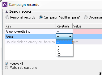 At the top of the Campaign records window you find radio buttons with which you choose if you want to search for records for a campaign or personal records connected to a specific agent, or campaign records in the whole organisation area.