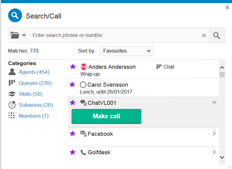 You can search and call a specified agent, or call the first ready agent with a specific skill, serving a specific queue or belonging to a specific area.