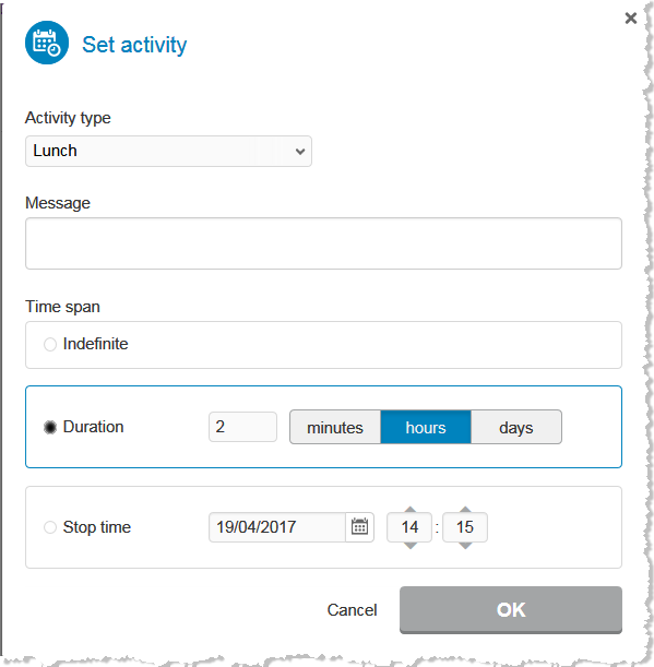 2. To add a message or change pre-defined duration, select menu choice Other... to open Set Activity.