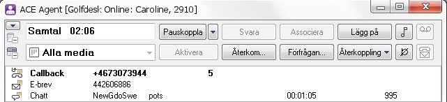 This is where you configure the look of the area for contacts in progress in ACE Agent, as seen above. In the picture below you see the Current contacts area in ACE Agent. The three contact types display different contact data.