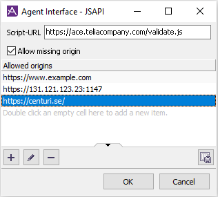 are allowed to use the interface. The Agent Interface – JSAPI window is where you configure the list of allowed origins.