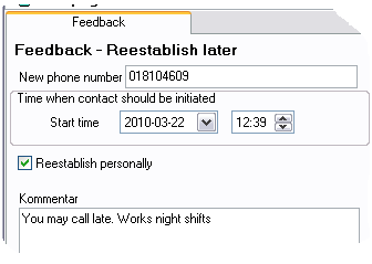 For the Reestablish later feedback in ACEAgent, the agent can always choose the time to call the customer again. Default value is that the customer will be called again in 25 hours. In ACE Admin you can change the default value, as a suggestion to the agent, by specifying the number of days, hours, and minutes that shall pass before the agent is called again.