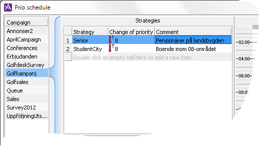 Priority strategies for a campaign is configured via the Prio schedule... button at bottom right part of the Campaigns window, found under the Media | Outbound telephony | Campaigns... menu choice.