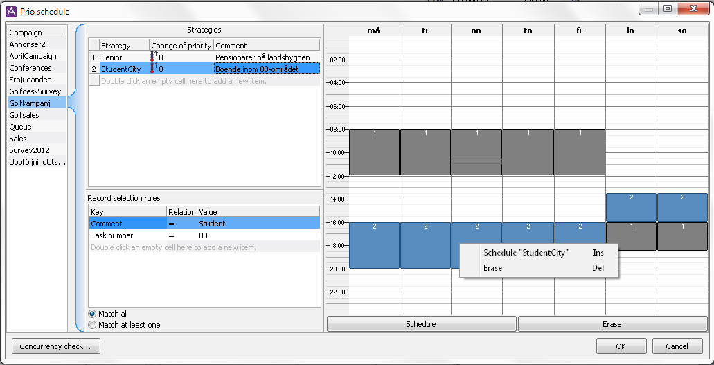 You change the schedule for a strategy by removing unwanted time intervals, and adding new ones. The changes are saved when you close the window with the OK button. All changes take effect immediately. If you e.g. start a campaign with a priority schedule, whose start time has passed, but whose stop time has not yet come, or change a schedule to just having passed the start time, the priority strategy will be activated automatically.
