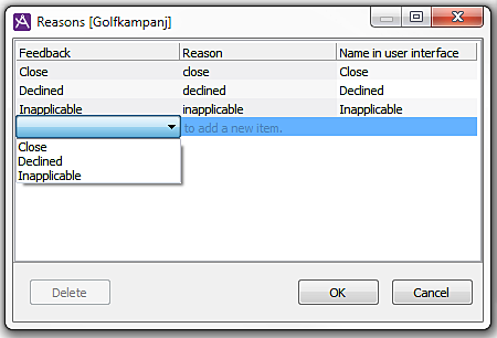 - In the Reason column you enter an internal name for the reason. The name is then visible in the campaign records that after handling have been given this feedback/reason.