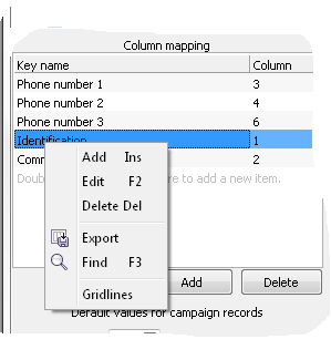 Under Column mapping header you specify the connection between the campaign’s contact data keys and the columns in the address file.