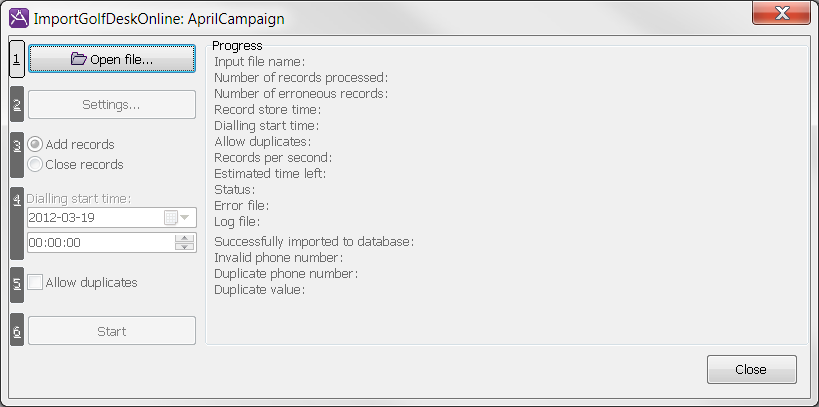 | Start | Start importing new records, or records that are to be closed. The database is updated. |