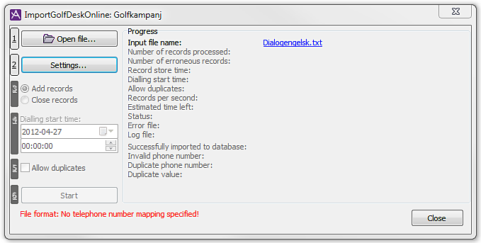 The Allow duplicate box shall be ticked if you at the import would like to allow duplicates of telephone numbers, i.e. if several records in the campaign can be stored with the same telephone number. This is not relevant if you have selected Close records. If the Allow duplicate box is empty, records with telephone numbers that already exist in the campaign will be refused by the database.