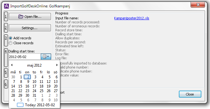 Before you can start the import you enter the desired start time for ring out for the imported records. This is not relevant for closing records. Default value is today, at midnight. To change the date, you either click on the calendar to the right of the date, where you can pick the desired date, or enter the date directly in the text field. You either enter the intended time directly or make your selection using the arrows to the right in the box.