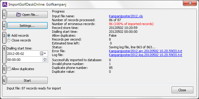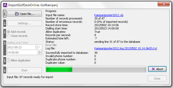 Abort button, the progress indicator stops and the name of the created log file is seen as a clickable link. Clicking on the file name opens the log file in an associated program, making it readable. In this file you see in plain language all the details about errors found, with references to each record in the error file mentioned above. - Successfully imported records