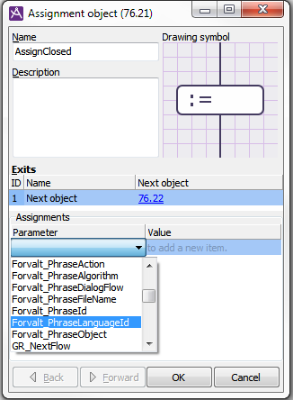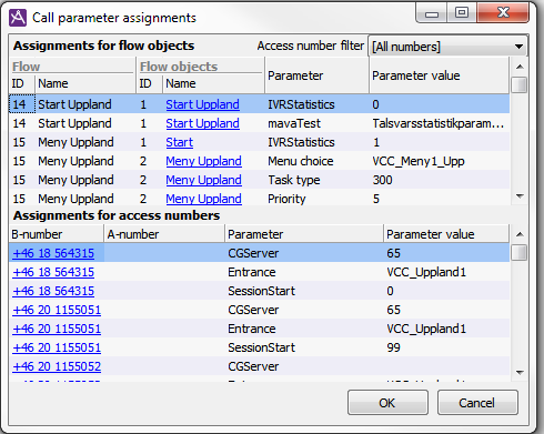 button to the bottom left in the Dialogue flows window, all assignments, i.e. call parameters for all flow objects and for all access numbers, are listed.