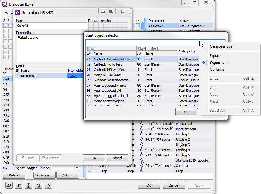 As you can see hidden flows as well here, you may have to minimize the content by filtering, with search text in the field at the top. What you enter matches the beginning of all values in the list. If you e.g. enter 16 you will just see the start objects in flows 16 and 168, and the 160 and 165 start objects.