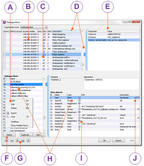 - Functions that you may have to view in a more collected way are found in separate views that are opened with the convenience keys at the bottom of the Dialogue flows window.