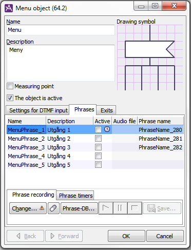 The Menu object Phrases tab shows the IVR Phrases that belong to a chosen IVR menu. This is where you indicate whether a phrase file should be enabled, i.e. whether a phrase file should be uploaded or not.