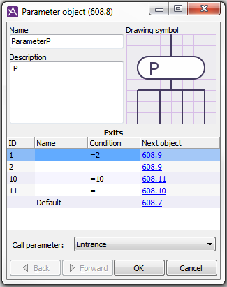 The parameter object window displays a table with exits and their respective condition. If the selected parameter meets the given condition for a certain exit, the flow is routed to this exit. The conditions are entered as text strings. You can change the name and condition for the existing exits except the last one – the last exit is used if none of the given conditions are fulfilled.
