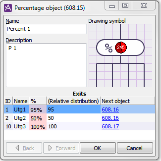 In the percentage object window, the call distribution on the exits stated is shown. You can change the distribution between different exits and the sum does not have to be 100%, as the distribution is made according to the relative values of the exits. The drawing symbol displays in colours when the distribution total deviates from 100%.