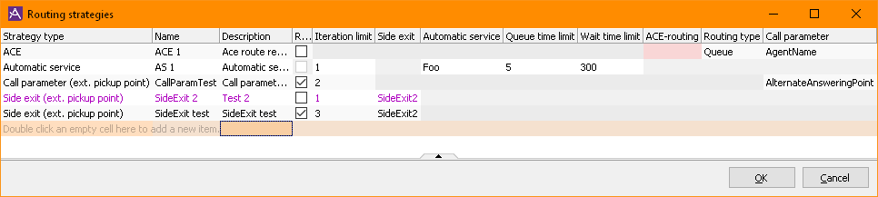 In the window you can create, delete and modify routing strategies. Some of the settings are only relevant for certain strategy types, and some of them are even mandatory. Mandatory fields that are not configured or contains errors are shaded red, whereas fields not relevant for the currently selected settings are disabled and greyed