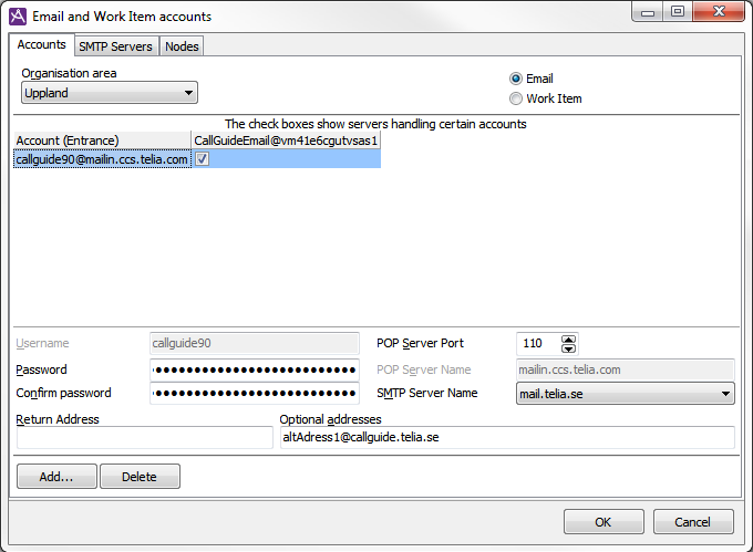 - Here you specify the organisation area’s accounts for email and work items, i.e. lists with the email accounts from where email is fetched and the entrances allowed for new work items.