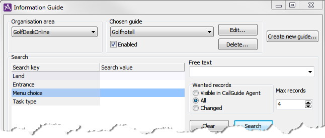 In ACE Admin’s Information Guide window you can, for the chosen guide, search for records using different selections. Under the Search key header you see the search keys specified at creation of the guide. If you want to limit the search for a search key, you can, in the Search value column, enter a value, or pick one from a drop-down list, depending on how the search key was created.