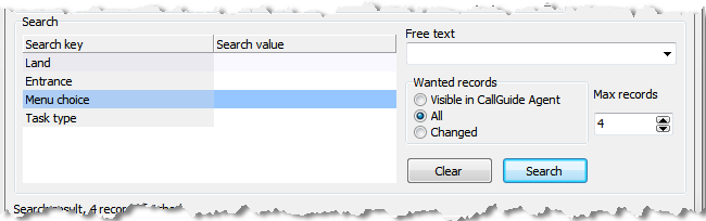 You can also search using your own words, in the Free text box. When you use free text search you get a list of the records containing exactly what you have entered in the title, or text. You can use free text search combined with search by values for search keys.