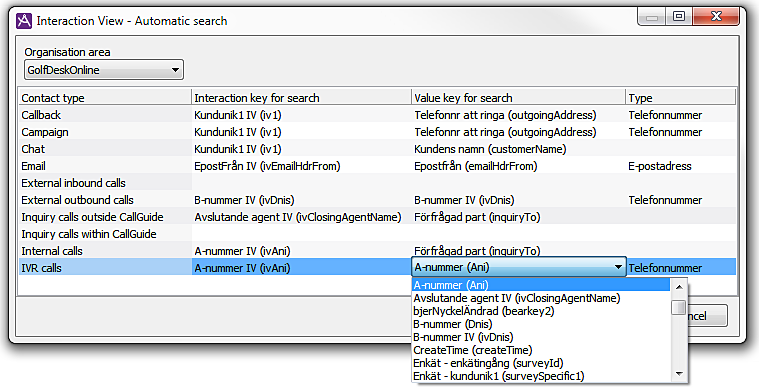 For the Interaction View function there are five special contact data keys, named iv1, iv2 etc... to iv5. These keys, like all other keys, are used to decide the specific information that shall be stored. What makes them different is that iv1, iv2 etc... to iv5 can facilitate information search for the agent. The information to be stored is decided by, per contact type, connecting the value from another existing contact data key to the iv1 to iv5 keys.