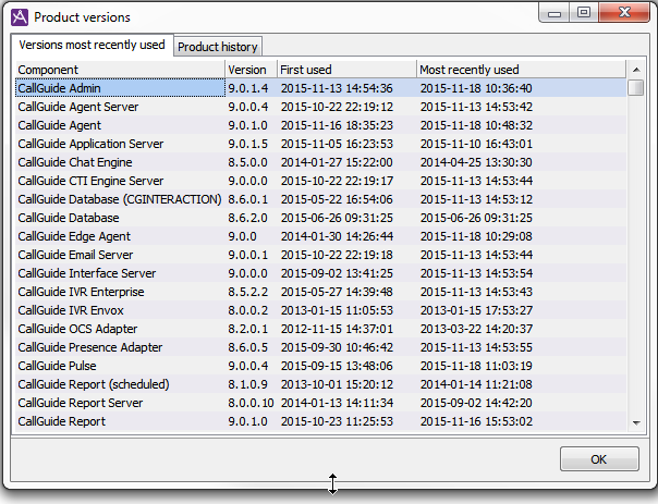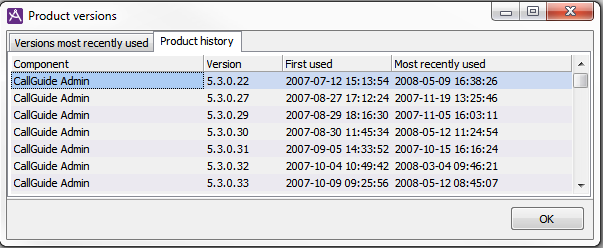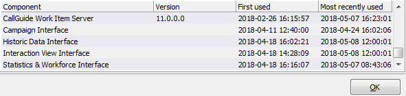 - First Used shows when the described version was first taken into use. More specifically, this time generally relates to the first start-up. In the case of ACE Database, the time relates to when the installation took place and for ACE IVR this is the time when the IVR version connected to ACE Server, provided that the IVR in your ACE solution is configured to inform the database of the version.