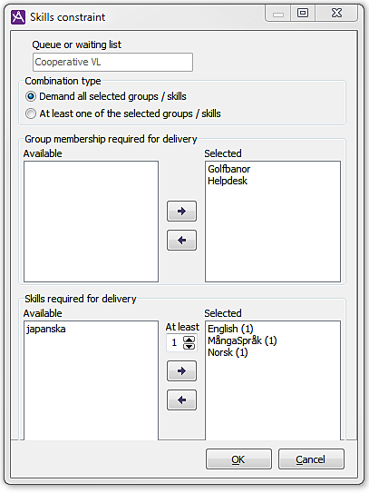 To move a group/skill between Available and Selected, select it and use the arrow that is pointing away from the list in which the group/skill occurs. When you are going to move a skill from Available to Selected in this way, you must also specify the minimum demands for skill level. This is done, before clicking on the right arrow button, by selecting the skill level in the box whose number can be increased and decreased.