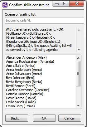 The Confirm skills constraint window shows the agents satisfying the requirements for serving the queue/waiting list. To enter this list, an agent must also have the access function for the service the queue/waiting list belongs to.