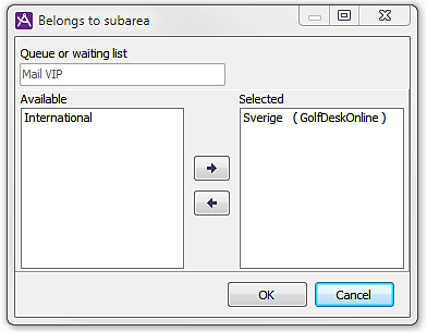 There are two lists here. The Selected list shows which subareas the queue/waiting list currently belongs to. The Available list shows which ones the queue/waiting list currently does not belong to. Move a subarea from one list to the other by selecting the subarea and clicking the arrow button pointing away from the list in which the subarea is found. This can be repeated any number of times before you click on OK to leave the window.