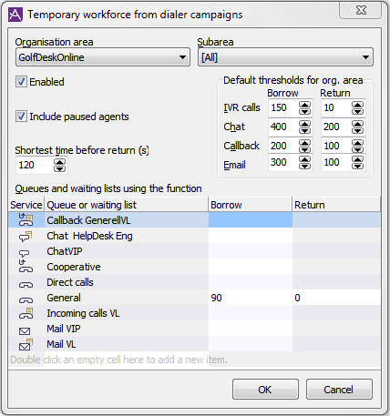 The queues and waiting lists involved in the borrowing procedure must then be added to the list in the lower part of the Temporary workforce from dialer campaign window, under Queues and waiting lists using the function. Furthermore, exceptions to the default thresholds can be set per queue/waiting list.