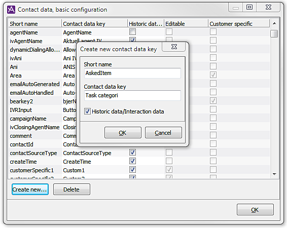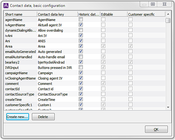 - Customer specific. Tells us whether this is a user created, or built-in key. Costumer specific keys are always editable. If the agents shall be able to edit the key value it has to be configured in the Contact data window in ACE Agent. See Configure Contact data for ACE Agent.