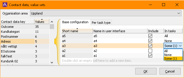 In the Contact data, value sets window you can create and remove value sets for contact data keys and add and remove values per task type.