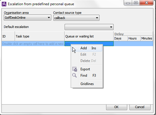 three fields where you can specify Delay. Enter, or click on the arrows, to specify after how many days, hours and/or minutes a personal email or a personal callback record shall be escalated to the selected queue/waiting list.