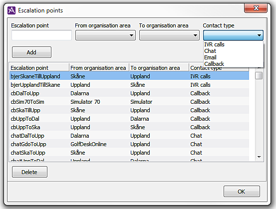 To delete an escalation point, select its row in the list, and click on the Delete button.