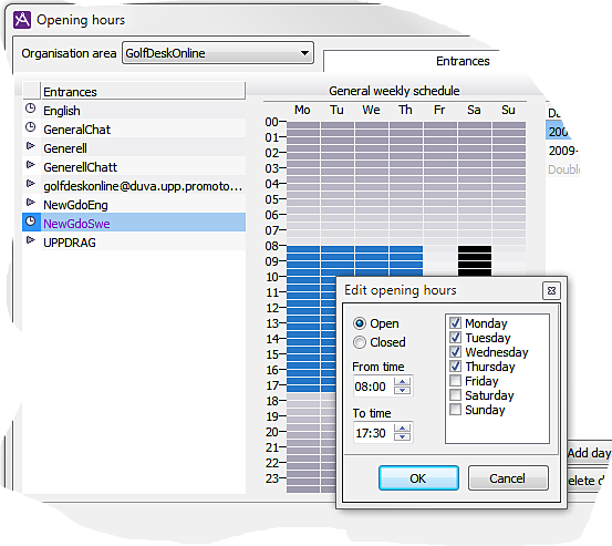 Under ACE Admin menu choice Routing | Opening hours... you configure opening hours for entrances and menu choices in locally placed IVRs of the ACE IVR Enterprise type, as well as for chat, and email entrances. The Opening hours menu choice also has a