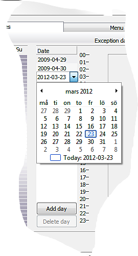 If you click on the Add day button, or double-click in the first empty row under the Date header, you see today’s date. If you click on the arrow by this date, a calendar is opened, where you can mark the date that will have different opening hours. Select the year and date using the arrows at the top of the calendar and then click on the date. When you have clicked on the OK button, you see the selected date under the Date header.