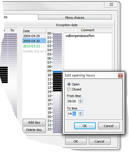 Sometimes you may have to define opening hours that apply to a specific date, such as for Christmas and Easter holidays. You do this in the right part of the Opening hours window, named Exception date.