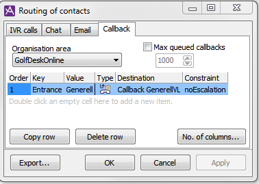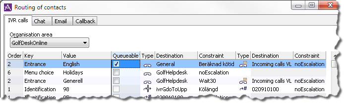 The window that the Routing of contacts... menu choice leads to, has four tabs; IVR calls, Chat, Email and Callback. Each of these tabs displays the routing table that is applicable for the type of contact in question.