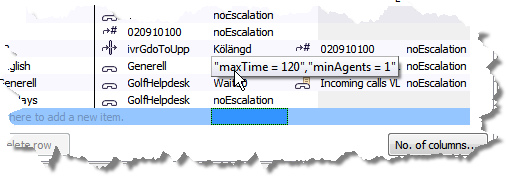 The routing table for IVR calls, i.e. incoming telephone calls may appear as in the screen shot below.