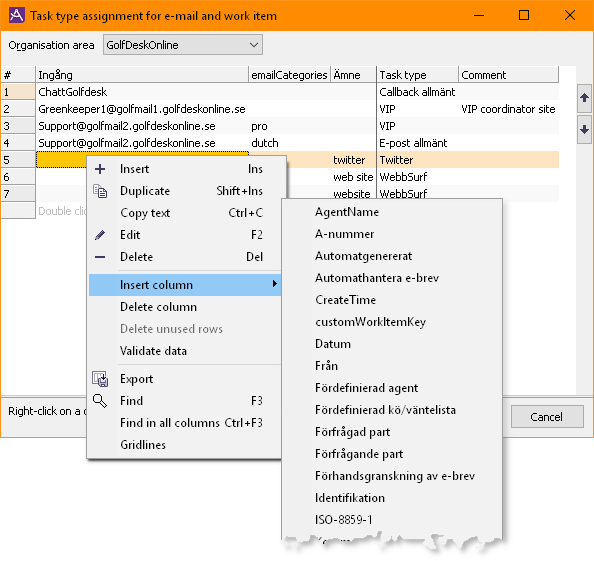 To simplify the configuration workflow in this window, there are a few special tools available in the context sensitive menu when you right click in this table.
