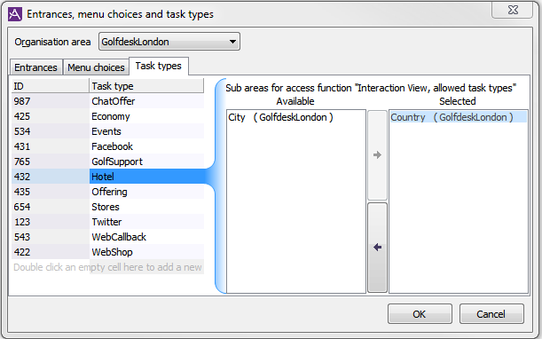 Each task type belongs to a particular organisation area. A task type can also be connected to a specific subarea, to restrict access to sensitive information in the ACE Interaction View contact archive. Interactions without task type, or without restrictions, belong to the organisation area where contacts have been handled and can be seen by all agents belonging to the area. The same task type can be specified for different organisation areas and subareas.