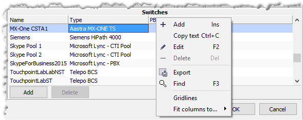 At the bottom right of the Switches for server based CTI window you see configured switches, with the name and switch type for each switch as well any net group affiliation.