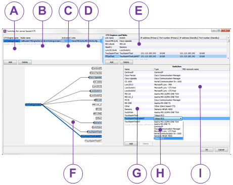 The Switches for server based CTI window is divided into four sections, described in the following overview picture. For details see Configure switches for server based CTI