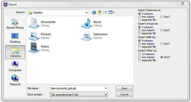 If the separate file radio button is ticked, the information will be divided into columns in a completely separate file. In addition to the suggested User accounts_organisation area shortname.xls file name, ACE will add a suitable extension. If the short name for the organisation area is zzz, the files for each export header will have the following names: