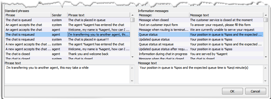 - Phrases are found in the chat history for both the agent and the customer. Described in section Standard phrases in chat history.