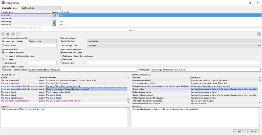 When you select an entrance in the area under the Chat entrances header, you will see all the configurations for the entrance that you can make via ACE Admin, such as Presenting chatting agent name in two ways, How to name the customer in chat history, Copy of chat history in email, Standard phrases in chat history and Automatically generated system messages.