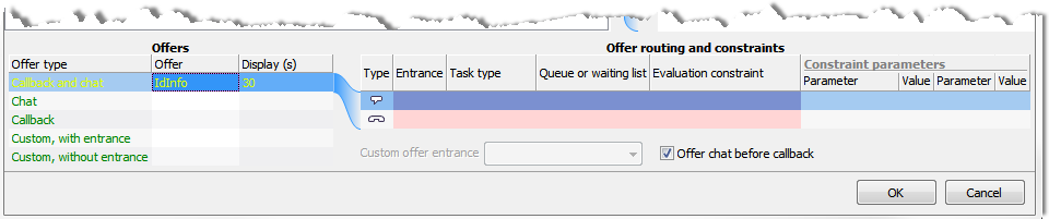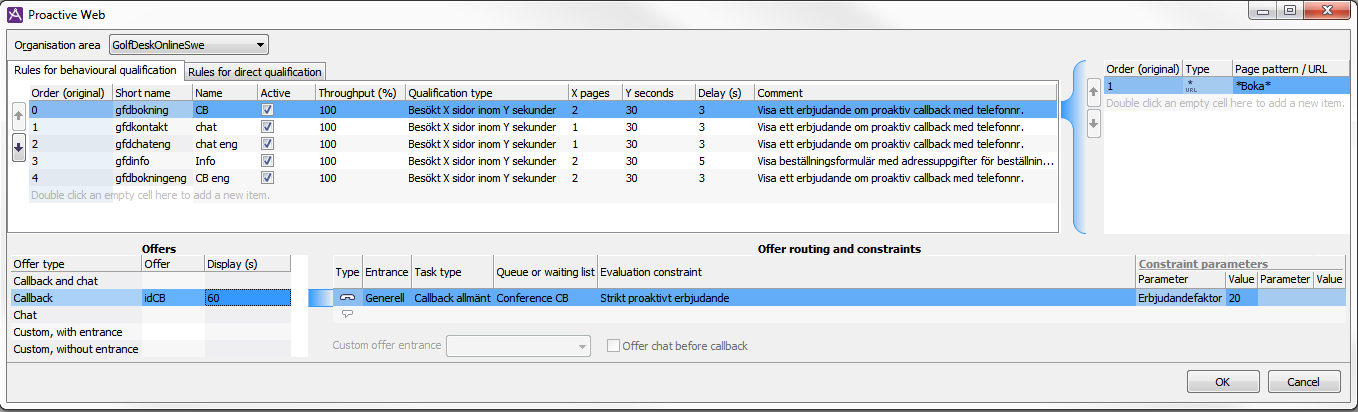 - Strictly proactive offer is used if you want to make sure that the person offered contact indeed is helped immediately. ACE automatically checks opening hours and number of ready agents. What you have to specify is Offer factor under the Constraint parameters title to the right. Since all surfers do not accept your offer you can have more offers presented than there are ready agents. If the offer factor is, for instance 20, 20 times more offers will be presented than there are ready agents.