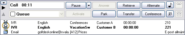 - If you have several parked contacts, you see the associated contacts at the top of the list of contacts in progress. Call B is at the top and the active call with customer A is seen in bold. A circle by the telephone icons shows that these contacts are associated with each other.