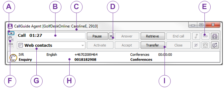 Below is an overview of the main window in ACE Agent. How the window is presented on your screen depends e.g. on your access rights, computer settings, which contact media you are handling, as well as your own choice of quick buttons. The various fields and button are here described briefly.