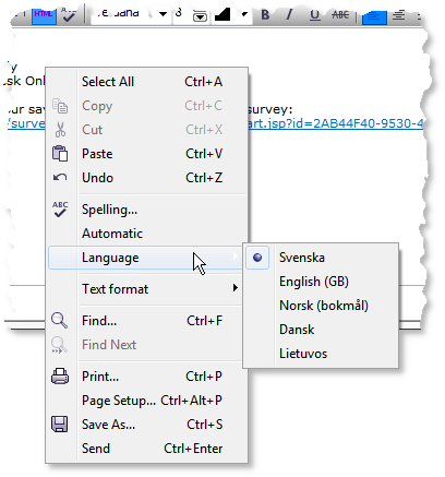 - Select the language for the spell-check. Swedish, Danish, Norwegian (standard), Lithuanian and British English. ACE remembers your last choice, but you can select different languages for different messages.